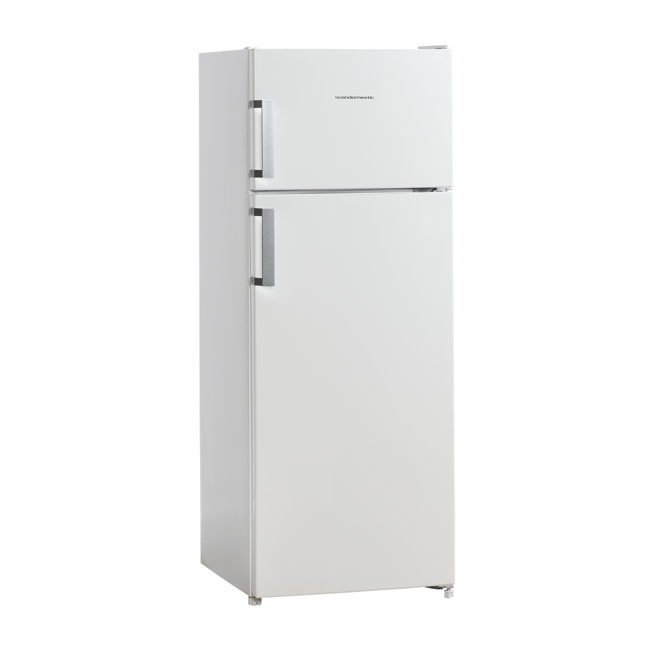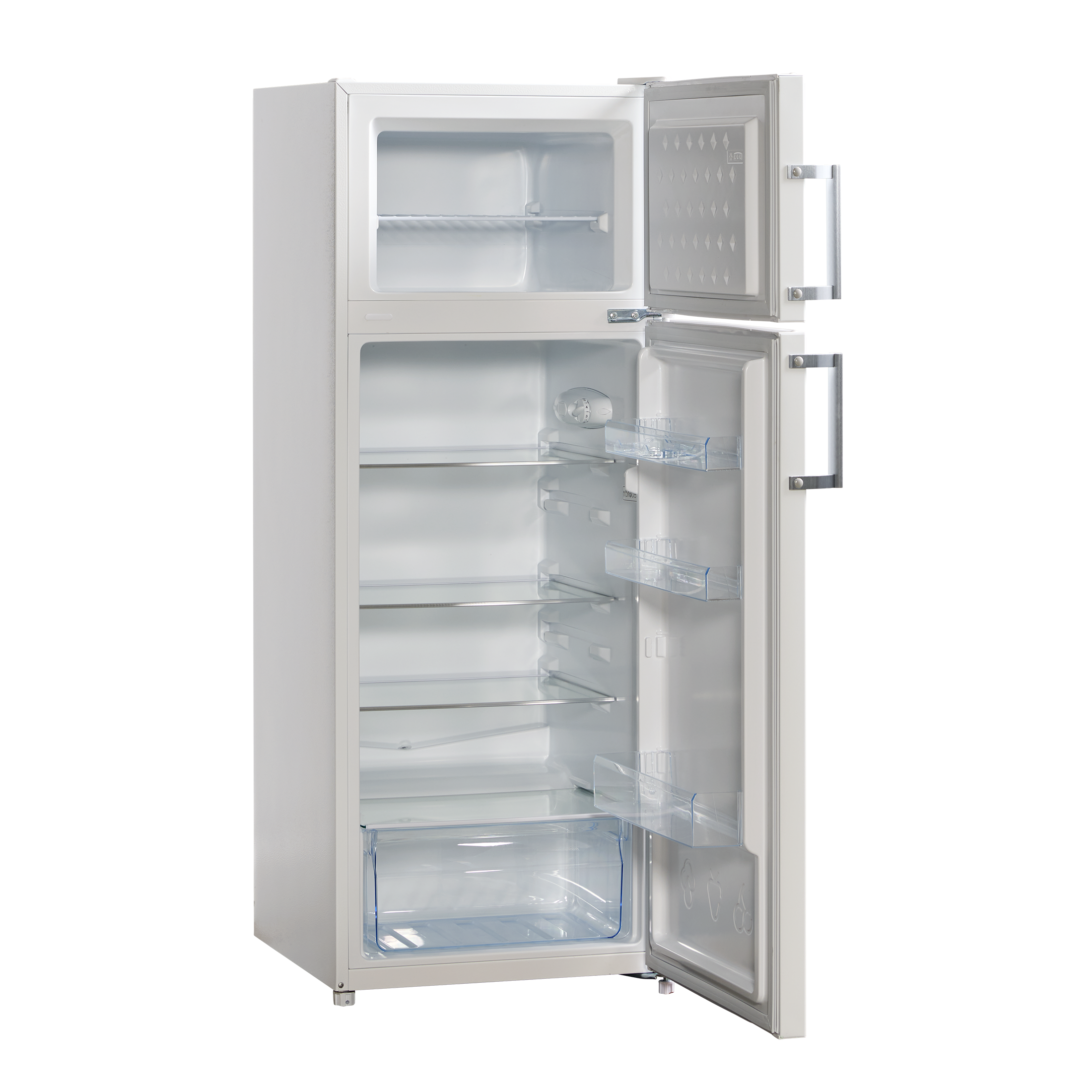 Et klassisk hvidt køleskab med et stål håndtag og trim på glashylderne som giver et mere eksklusivt udtryk.