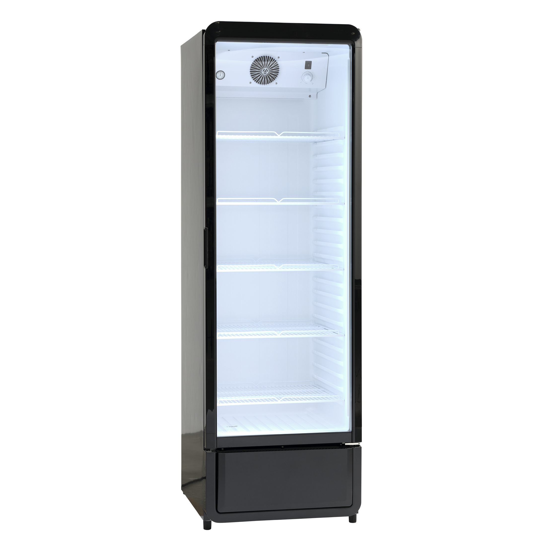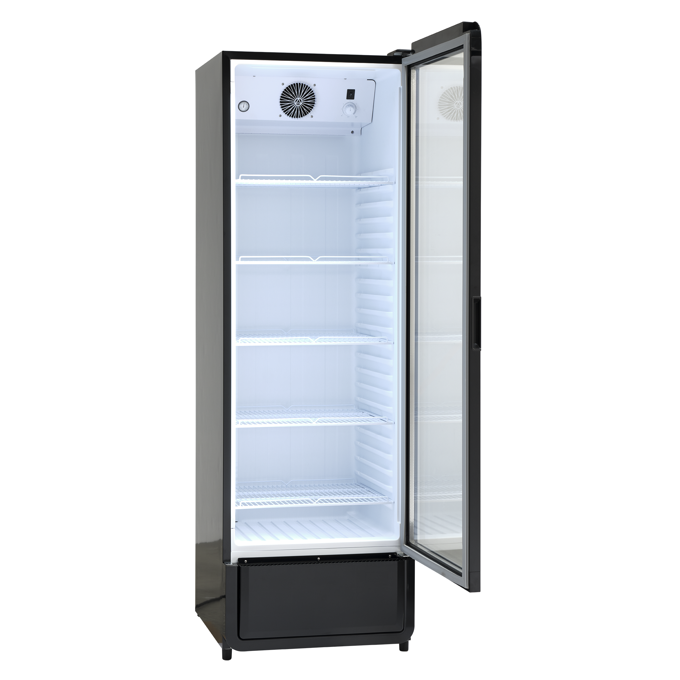 DC380BD er et stort 1-dørs displaykøleskab i sort med 377 nettoliter køleplads.