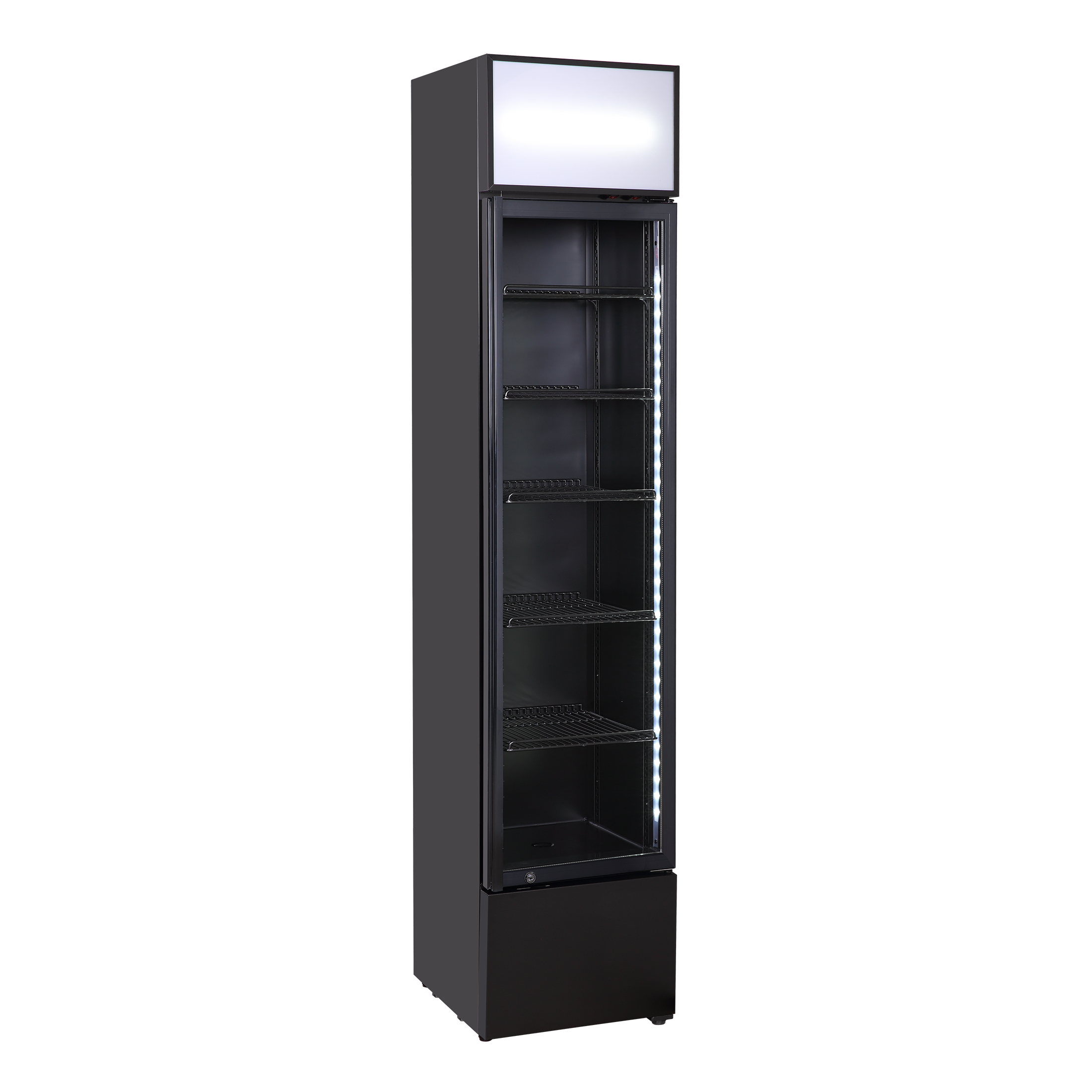 The integrated black lock in the door ensures safe storage, while the all-over black handle supports the stringent design and provides a consistent finish. The vertical LED light in the front adds a modern and inviting look, while at the same time presenting the products optimally.