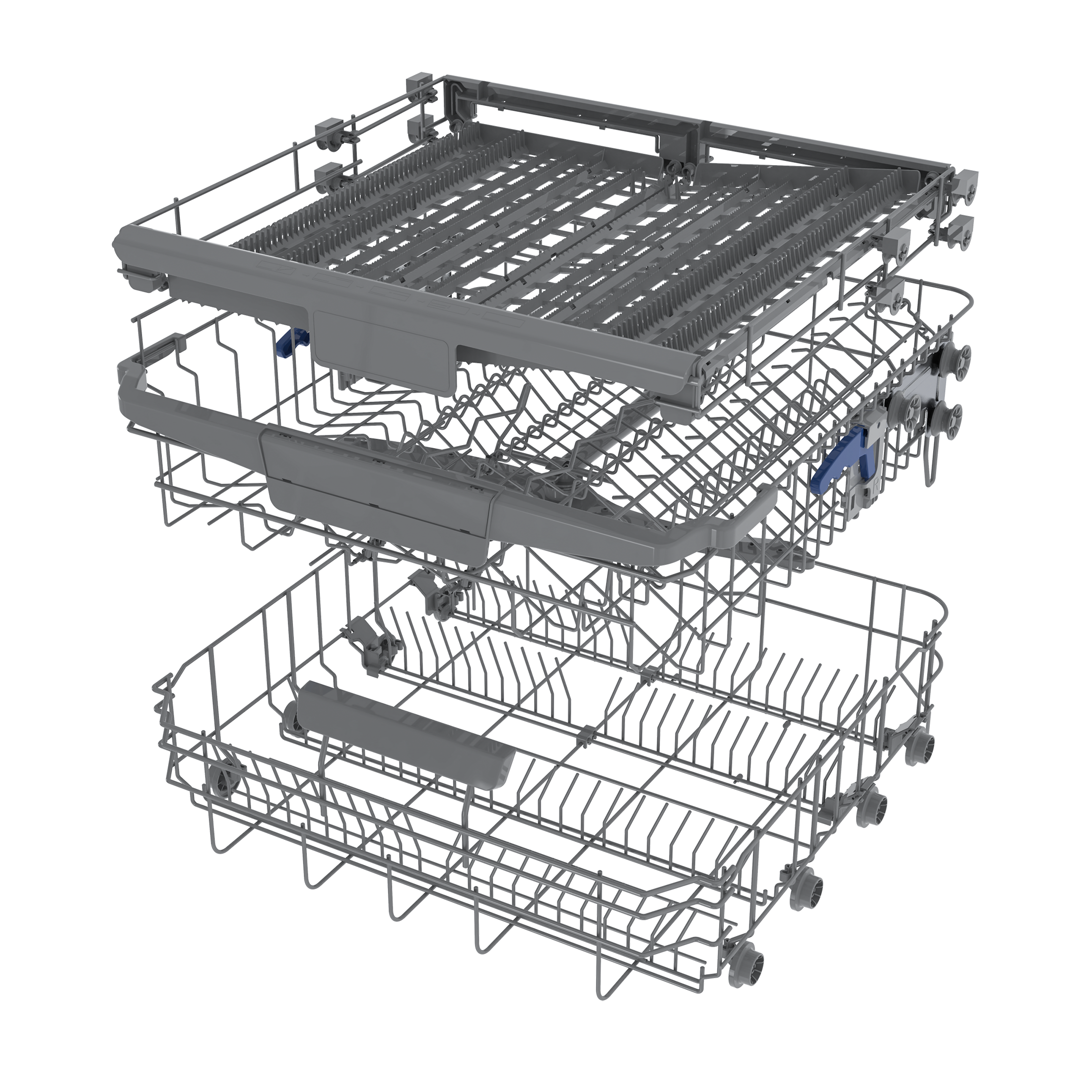 The top cutlery tray gives you extra space in the underbasket, and since the cutlery is separate and never clusters together, a better washing result is achieved and scratches are also avoided. In addition to the cutlery being more clean in this tray, there is also a hygienic advantage when emptying cutlery, as you do not touch the dining heads as you do with standard cutlery baskets. Furthermore, the cutlery tray can also be pushed together to make room for tall glasses in the middle basket. The top basket provides space not only for cutlery, but also for pot spoons, salad cutlery and smaller tableware items such as espresso cups.