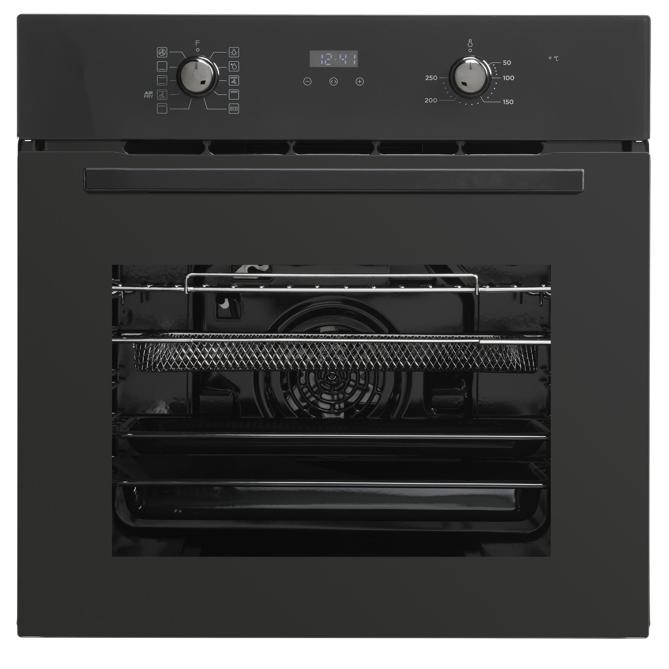 Multifunction oven for installation in stylish, black design, with large 70L oven compartment and Air Fryer function.