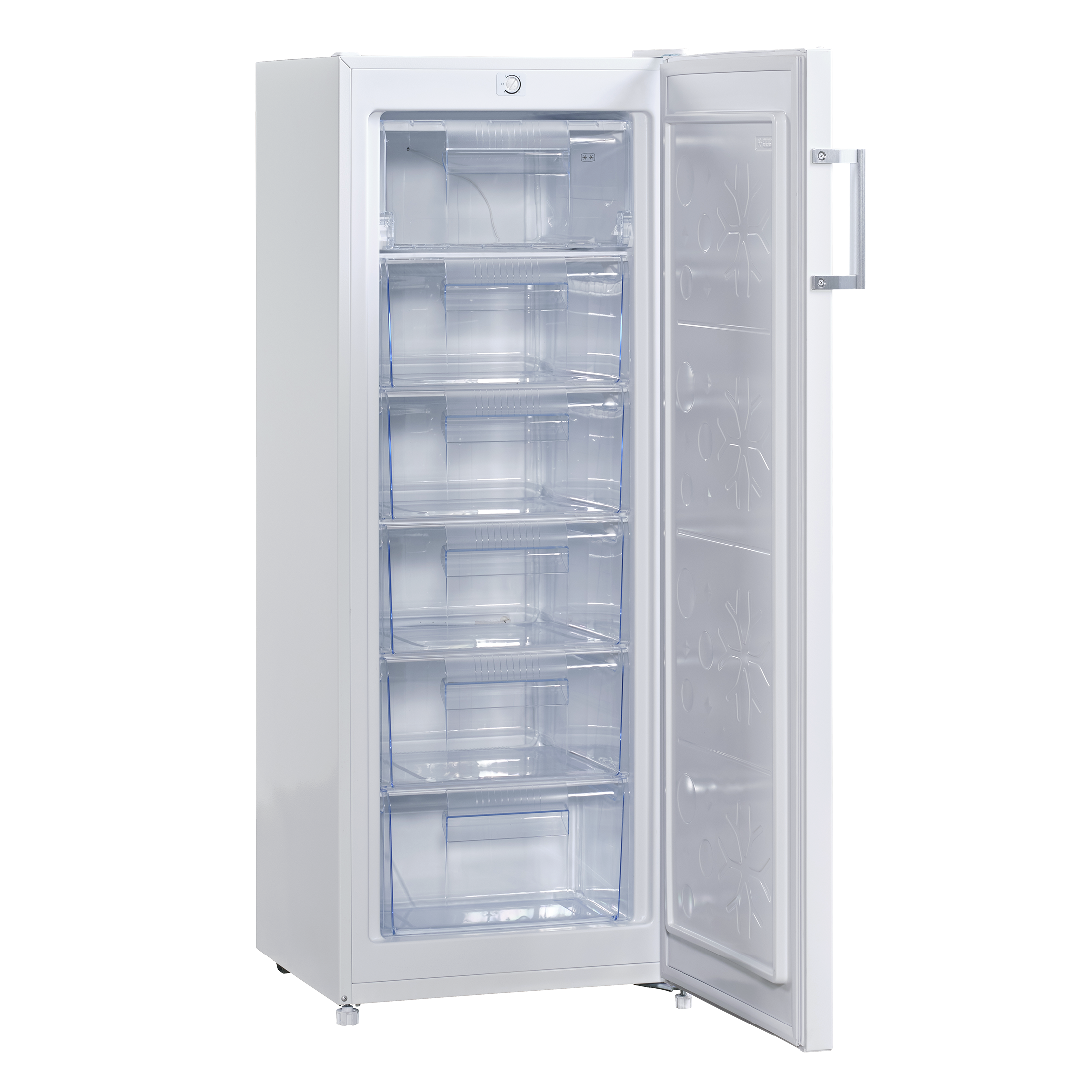 Praktisk fryseskab med 177 liter kapacitet og statisk frys. Fryseskabet har en god størrelse til de fleste husholdninger og er ideel som supplement til at opnå ekstra frysekapacitet, hvis et køle-/fryseskab ikke længere er nok i husstanden. Fryserens øverste hylde har en fryseklap og under den er der fem transparente fryseskuffer. Det fritstående fryseskab kommer med justerbare fødder, så det kan stå plant på alle underlag. Skabsdøren åbnes til højre, men døren kan også vendes, dermed er skabet fleksibelt at placere i alle rum.