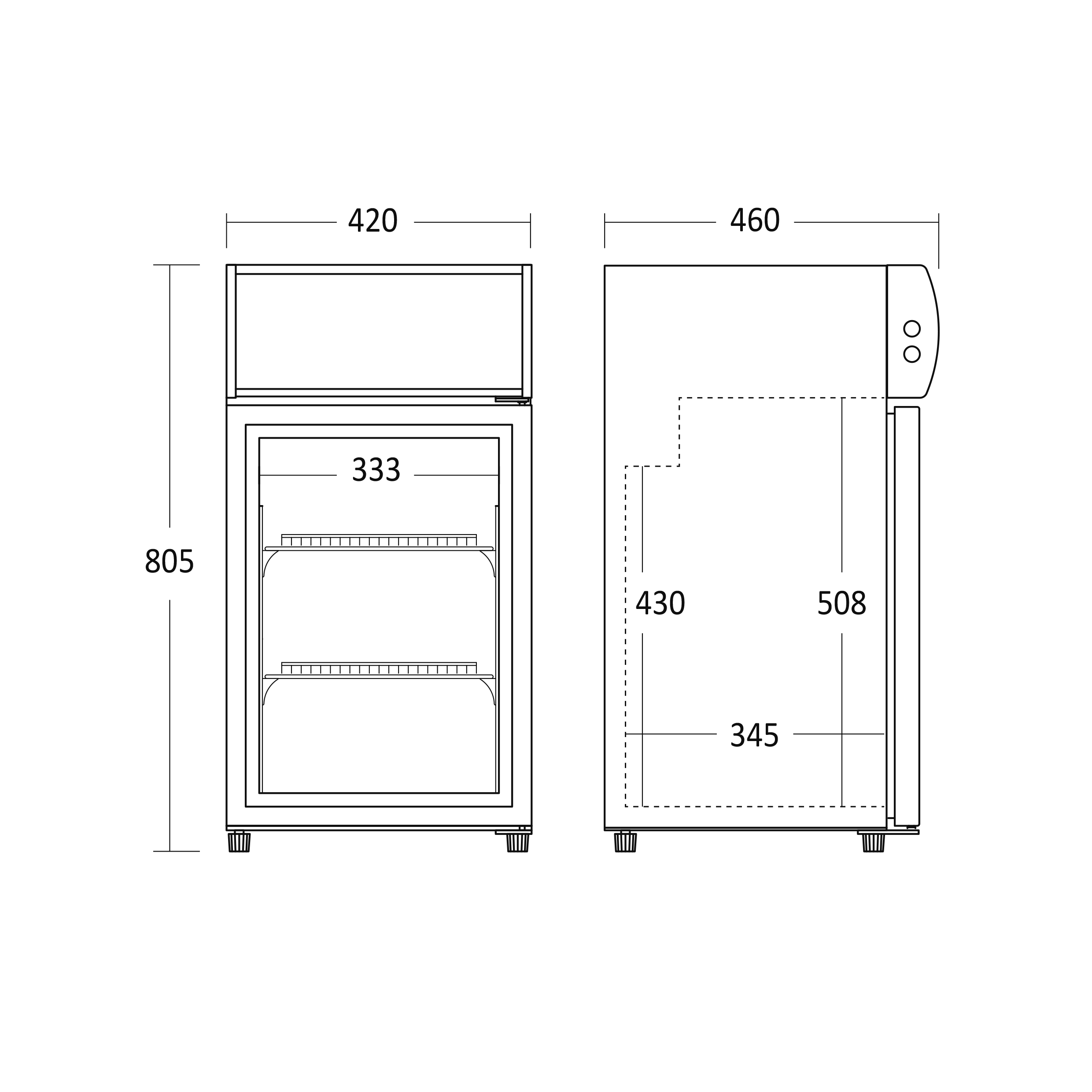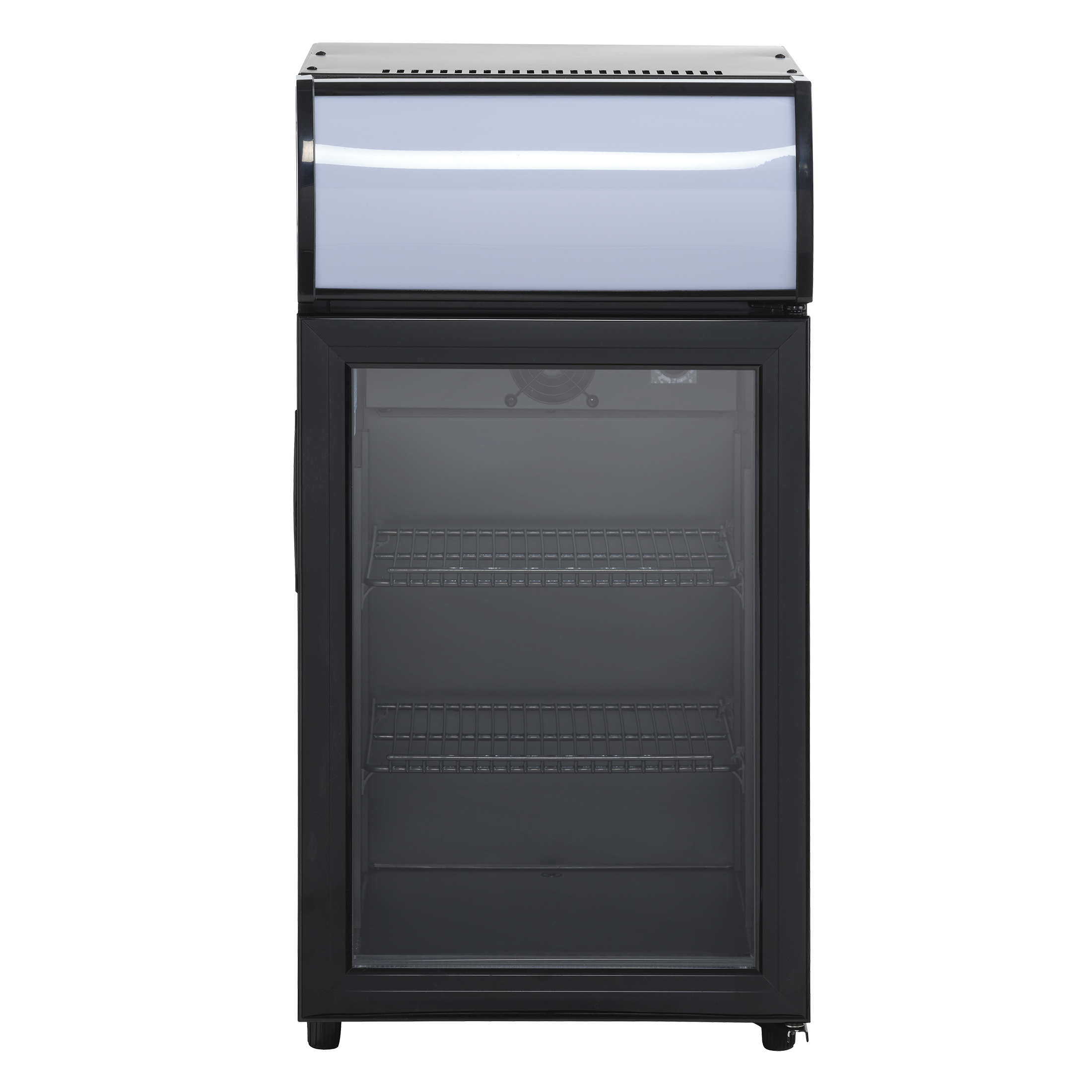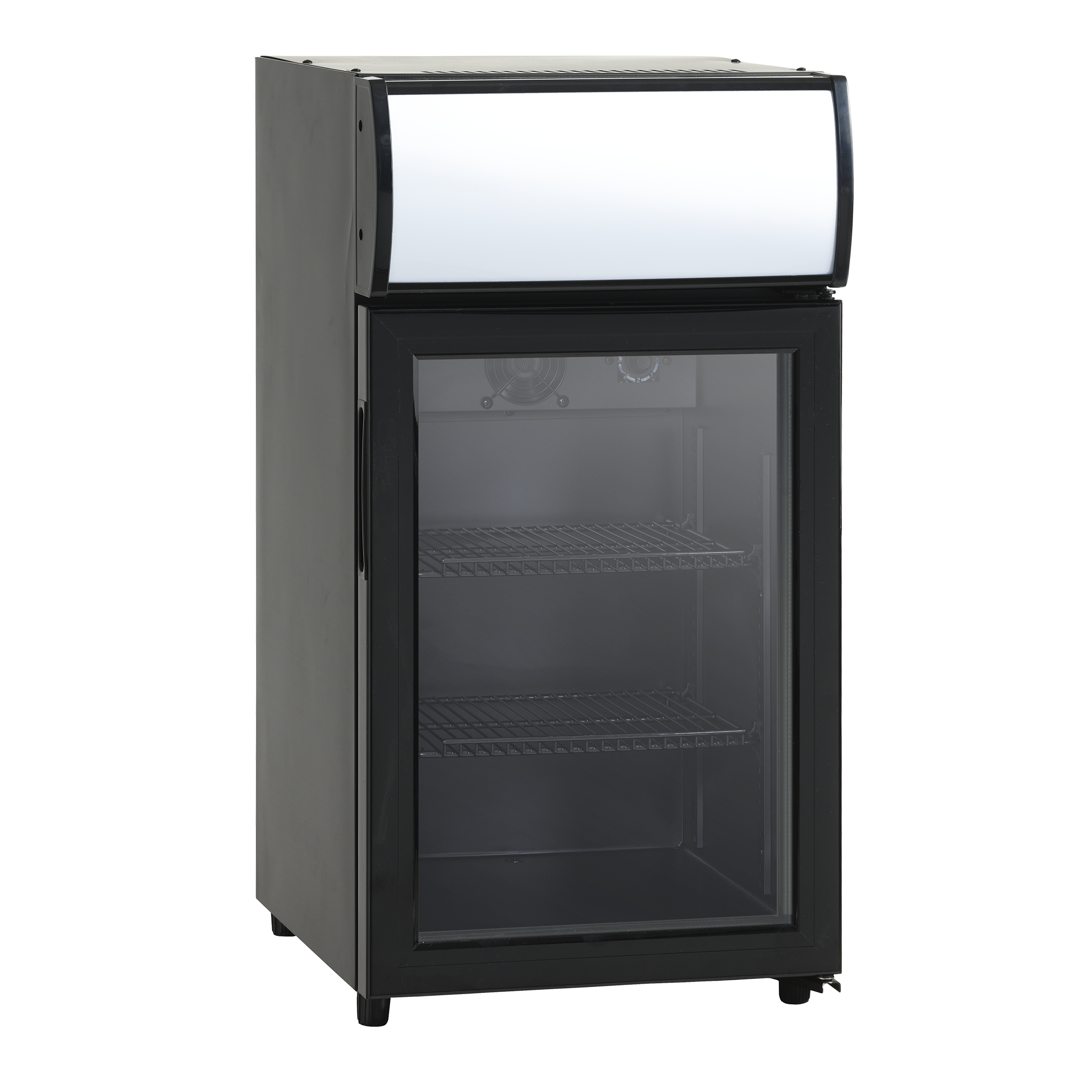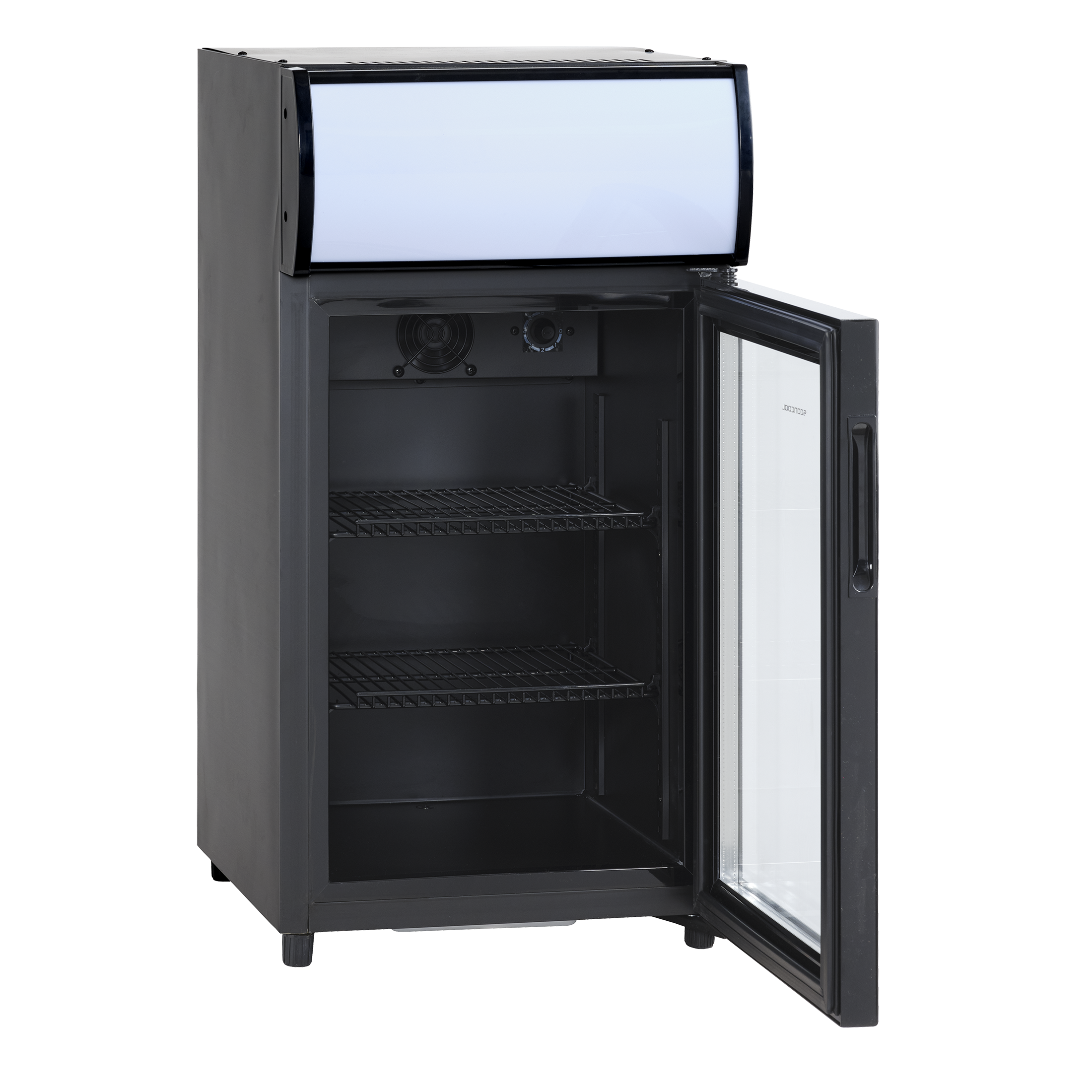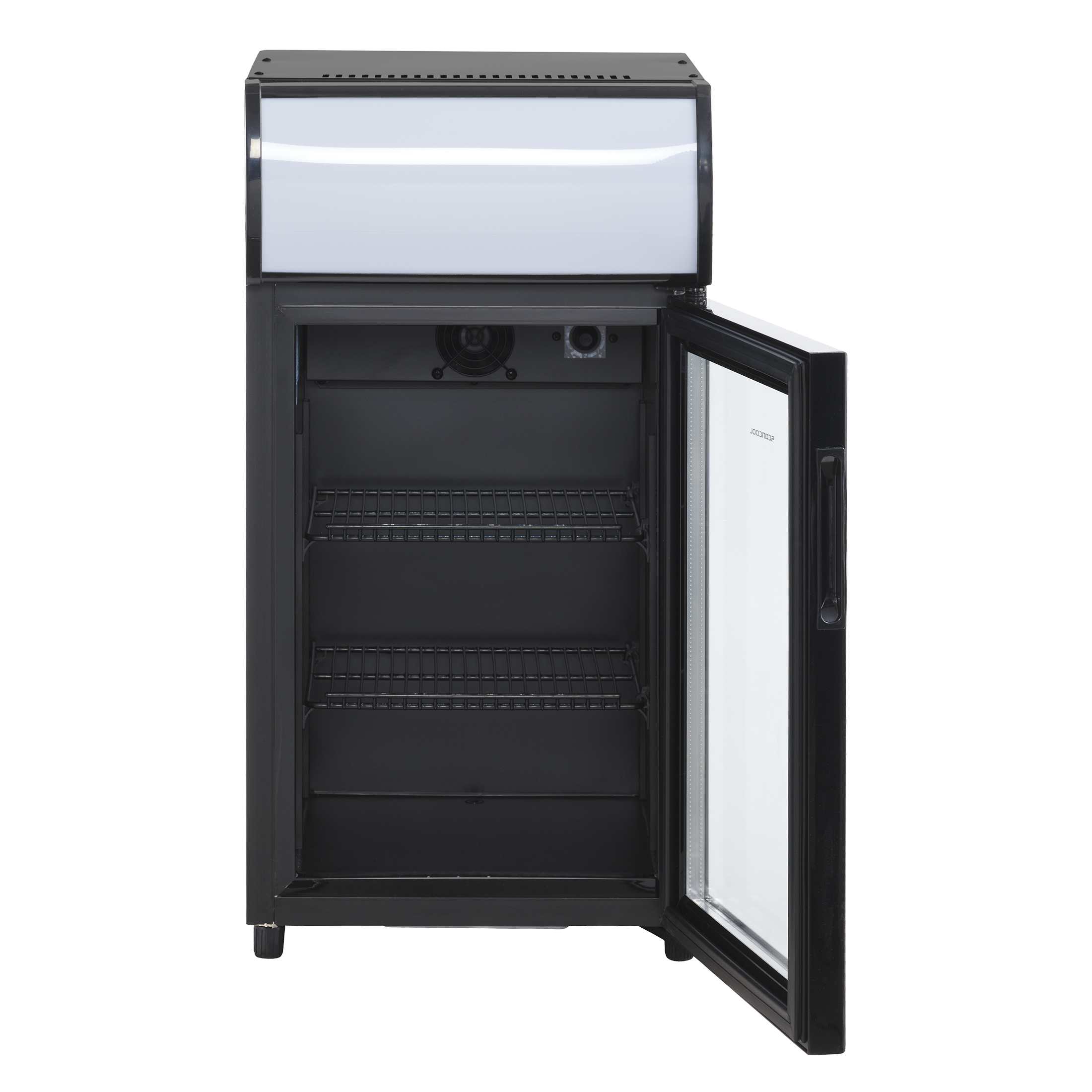 SC 51 BE er et lille 1-dørs display køleskab, med 44 netto liter kølerum og lysskilt.