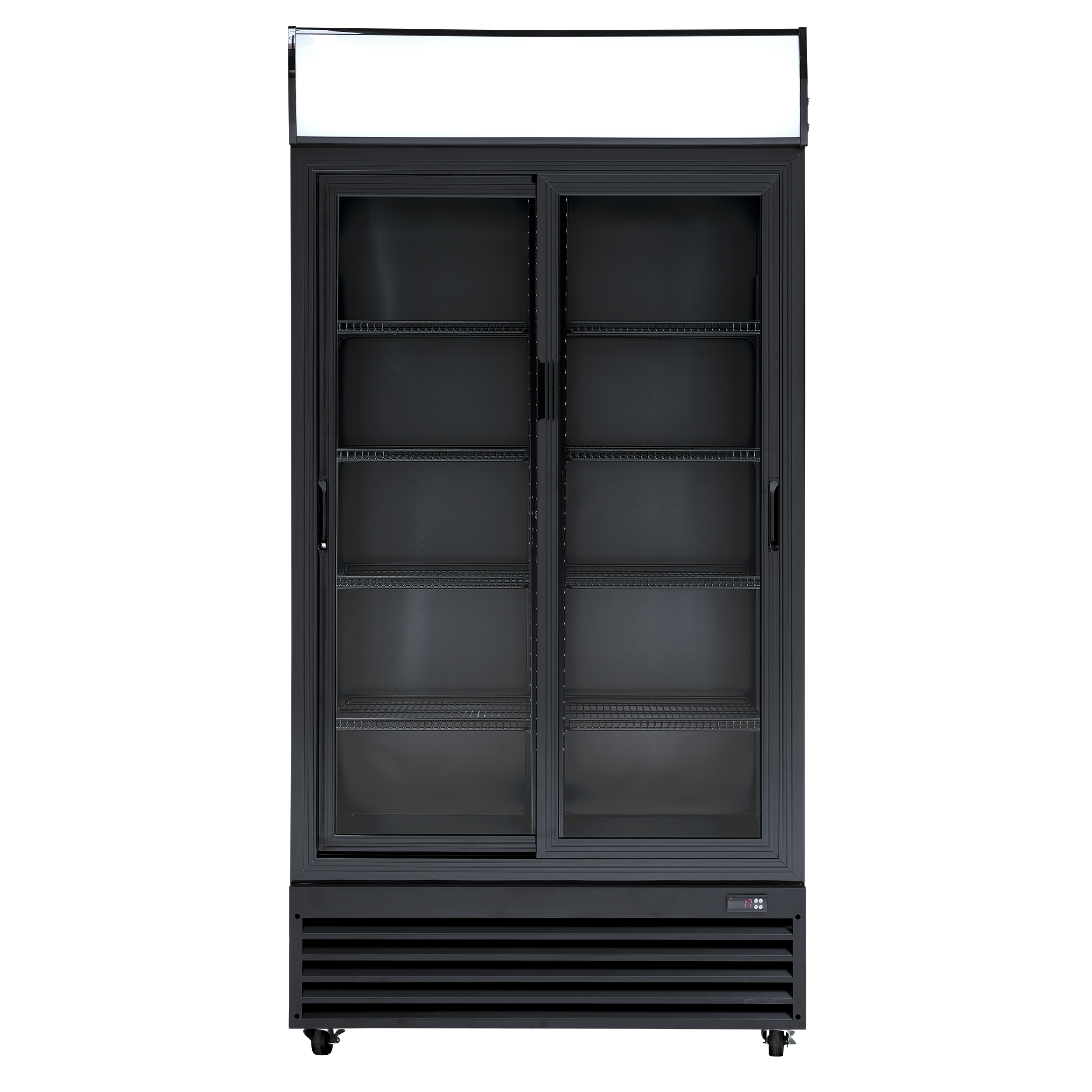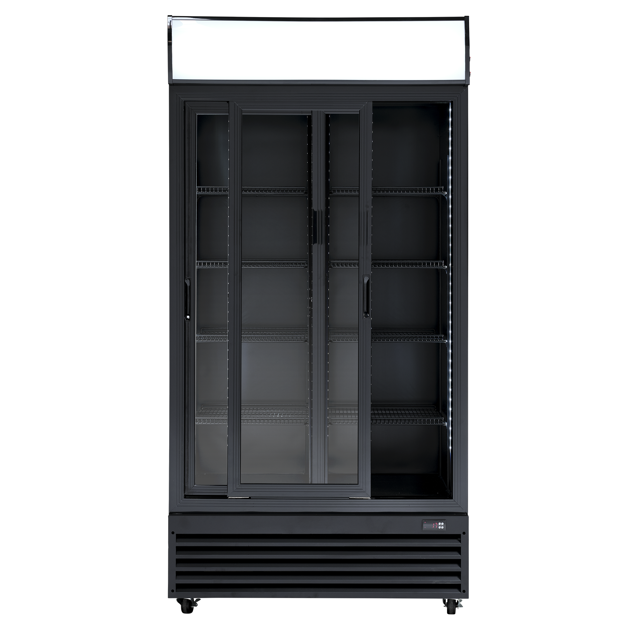Leveres med 8 sorte, kraftige trådhylder med tråde som sikrer at alle typer glas, dåser og flasker står stabilt på hylderne. Hylderne kan justeres i mange niveauer. Skabet har 4 hjul, så det altid er muligt at flytte, også når det er fyldt op. Skabet har skydedøre med lås, så det er muligt at aflåse skabet. Dørene lukker automatisk hvilket altid minimerer temperaturstigninger. Håndtag er integreret i døren.