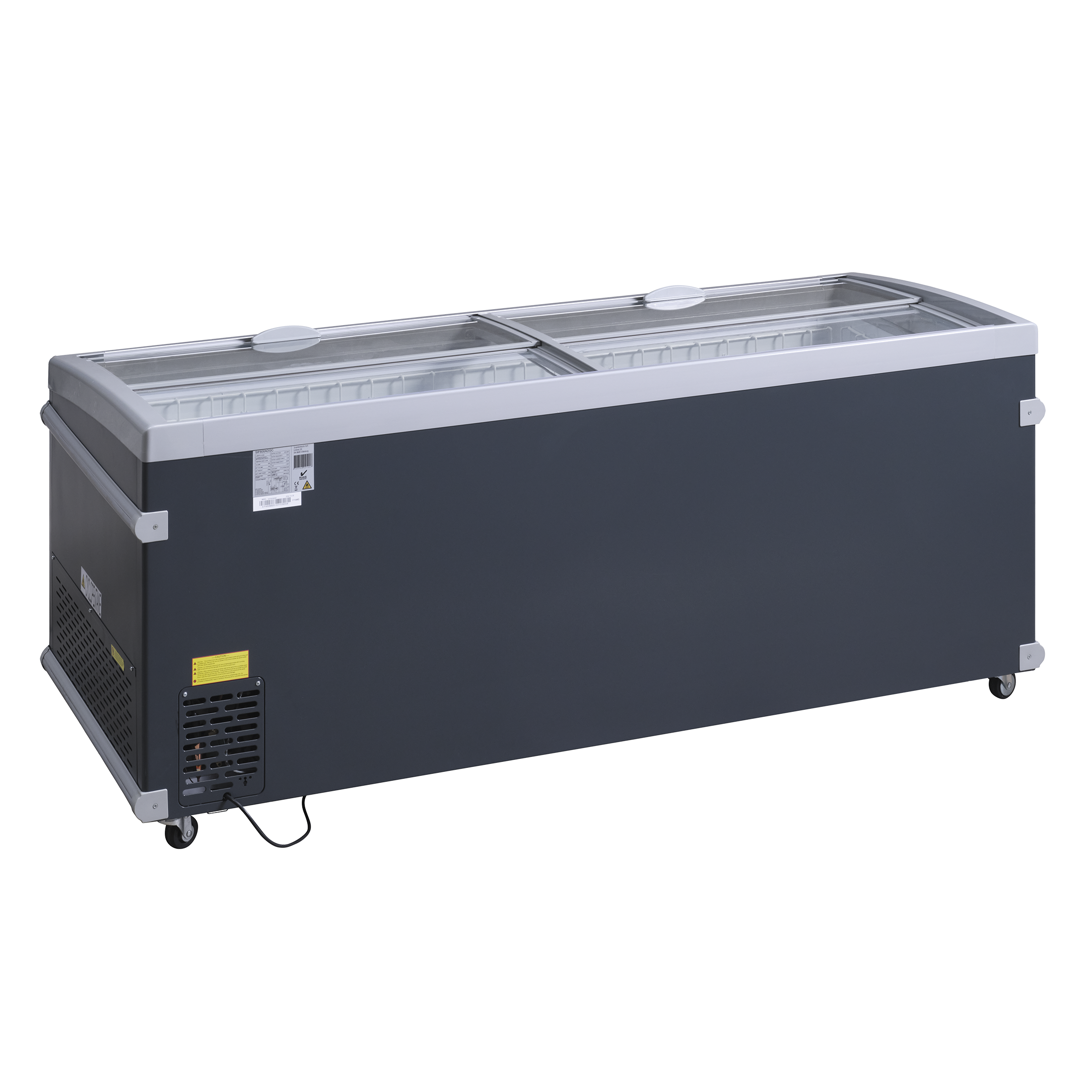 Fryseren leveres med buede transparente låg som holder ekstra på kulden og med stærkt aluminiumshåndtag.