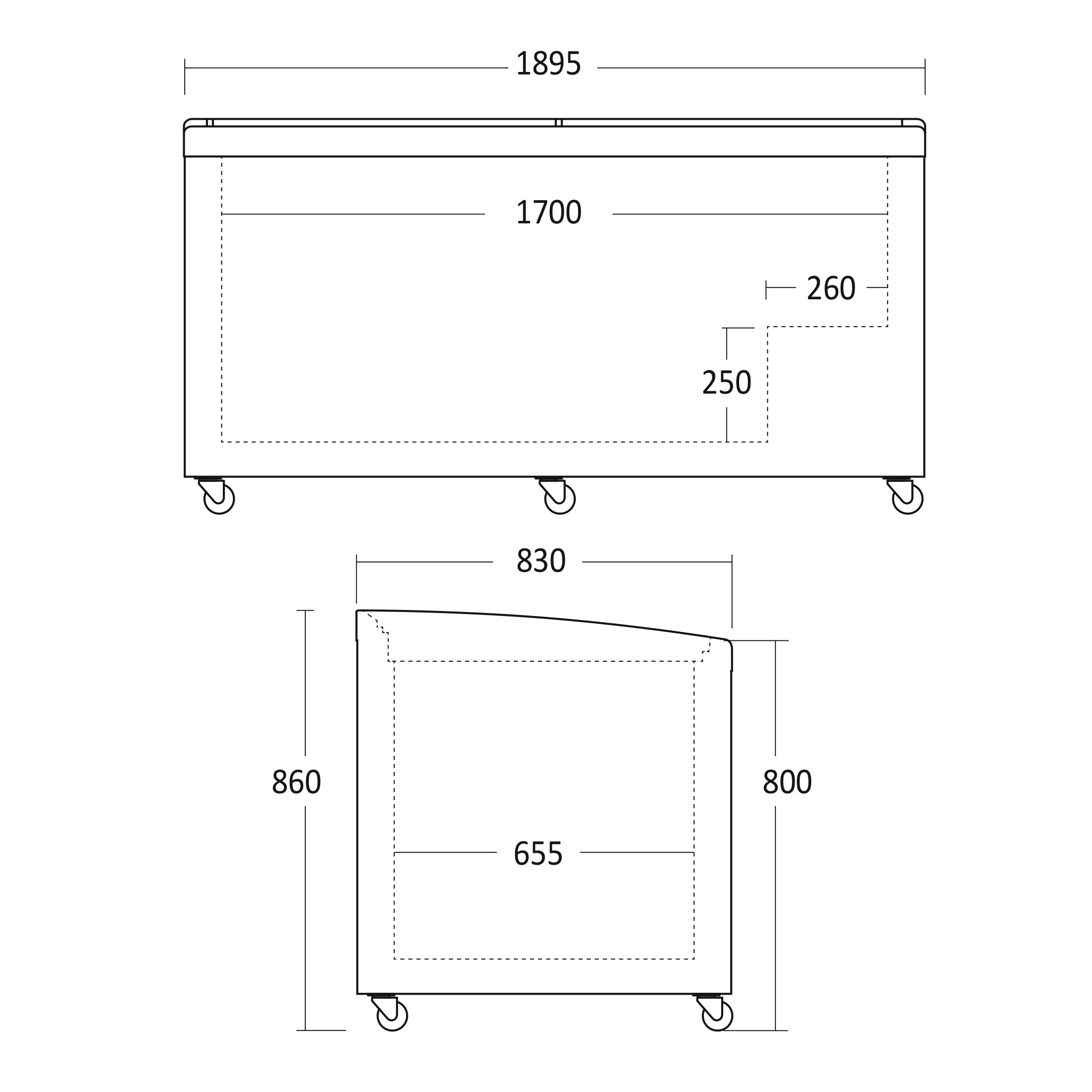 Indvendige mål, HxBxD, mm: 590 x 1700 x 655