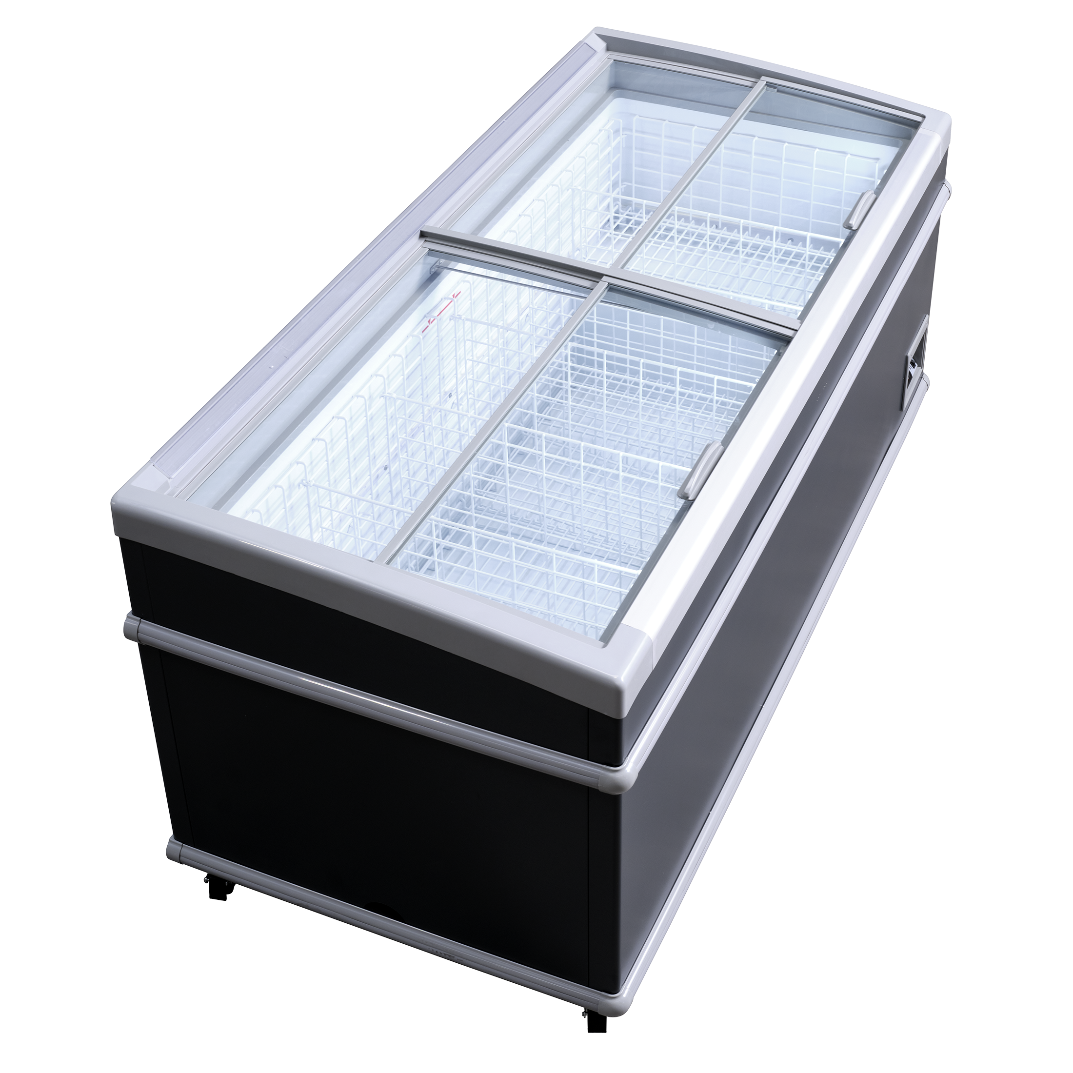 Fryseren leveres med buede transparente skydelåg som holder ekstra på kulden og med stærkt aluminiumshåndtag.