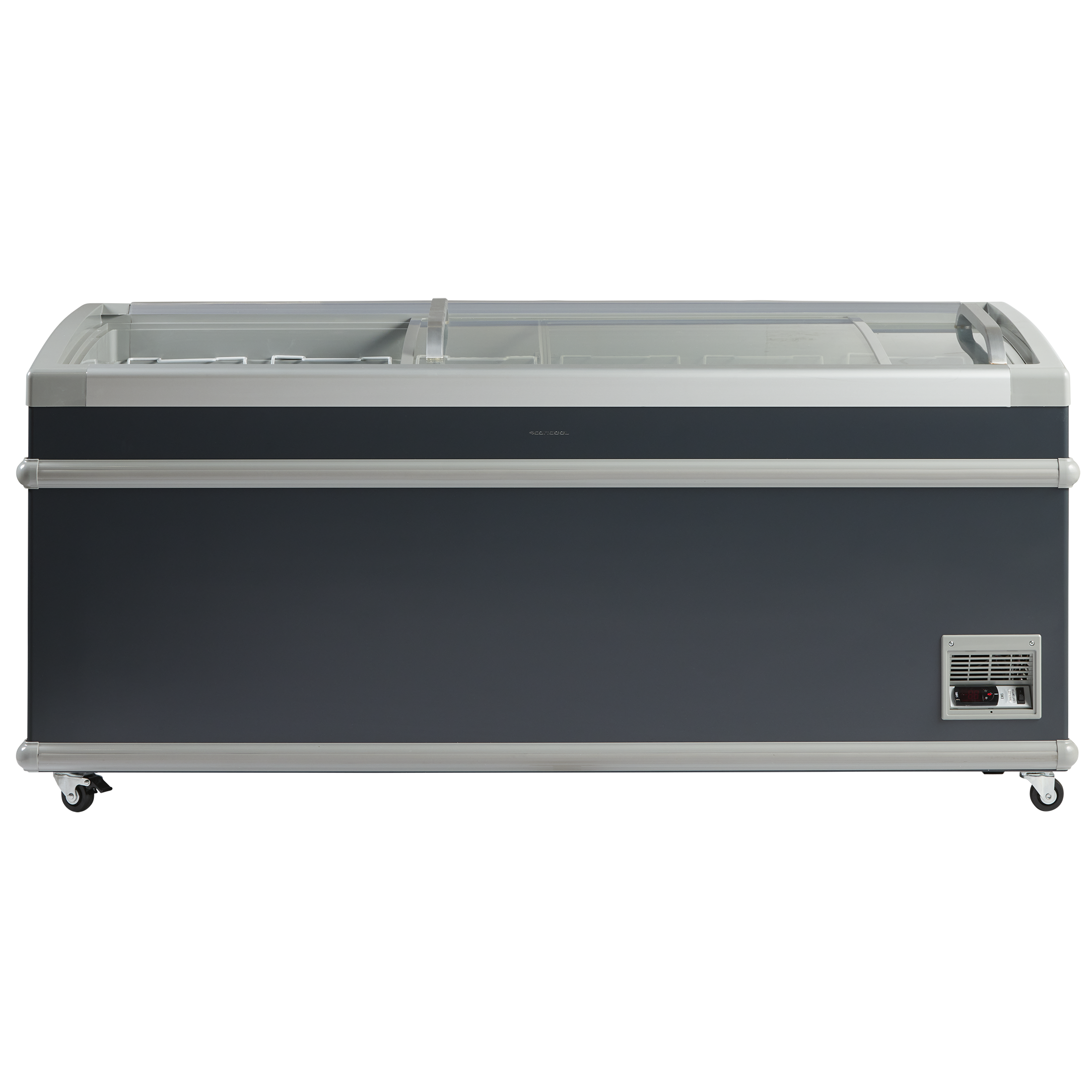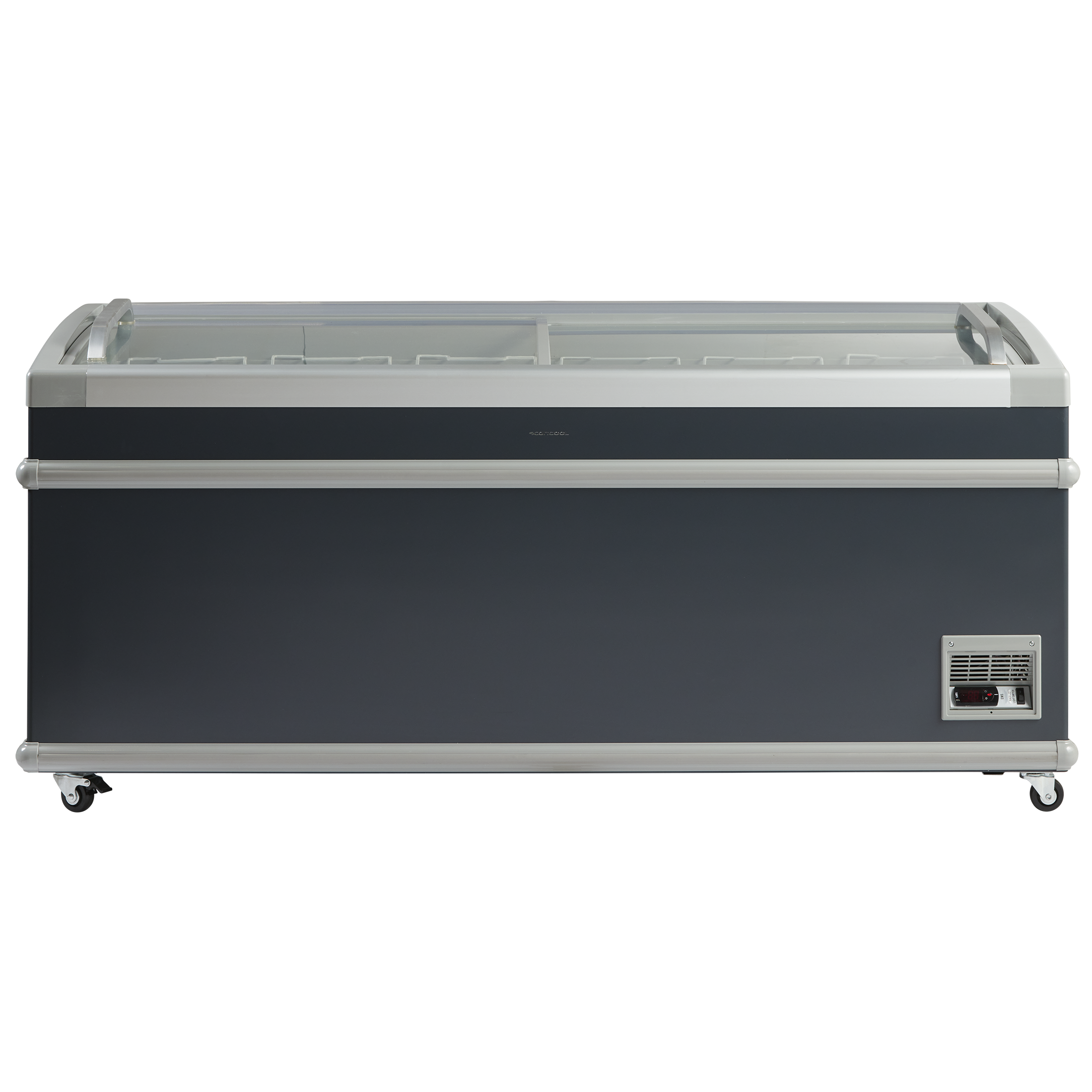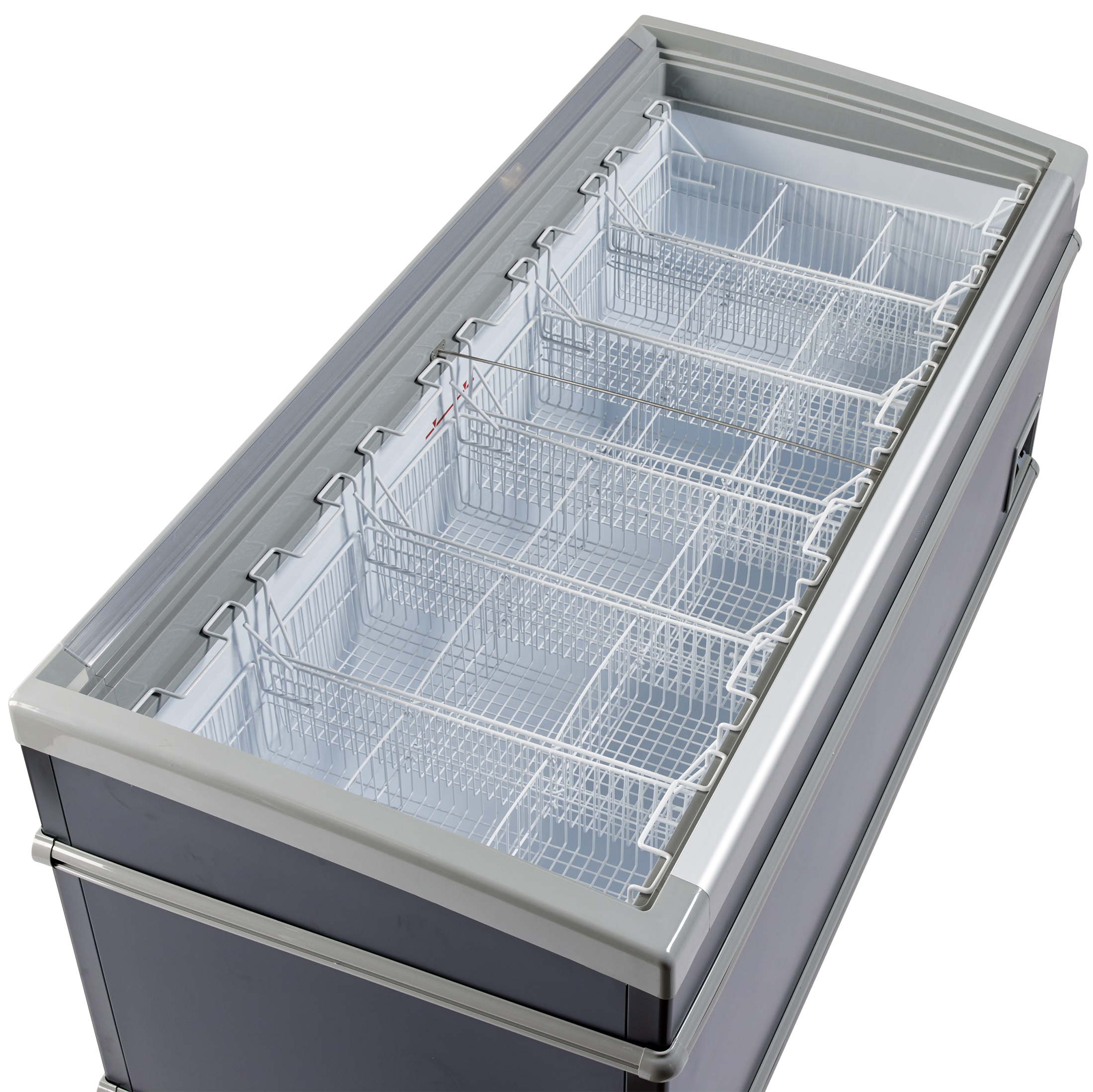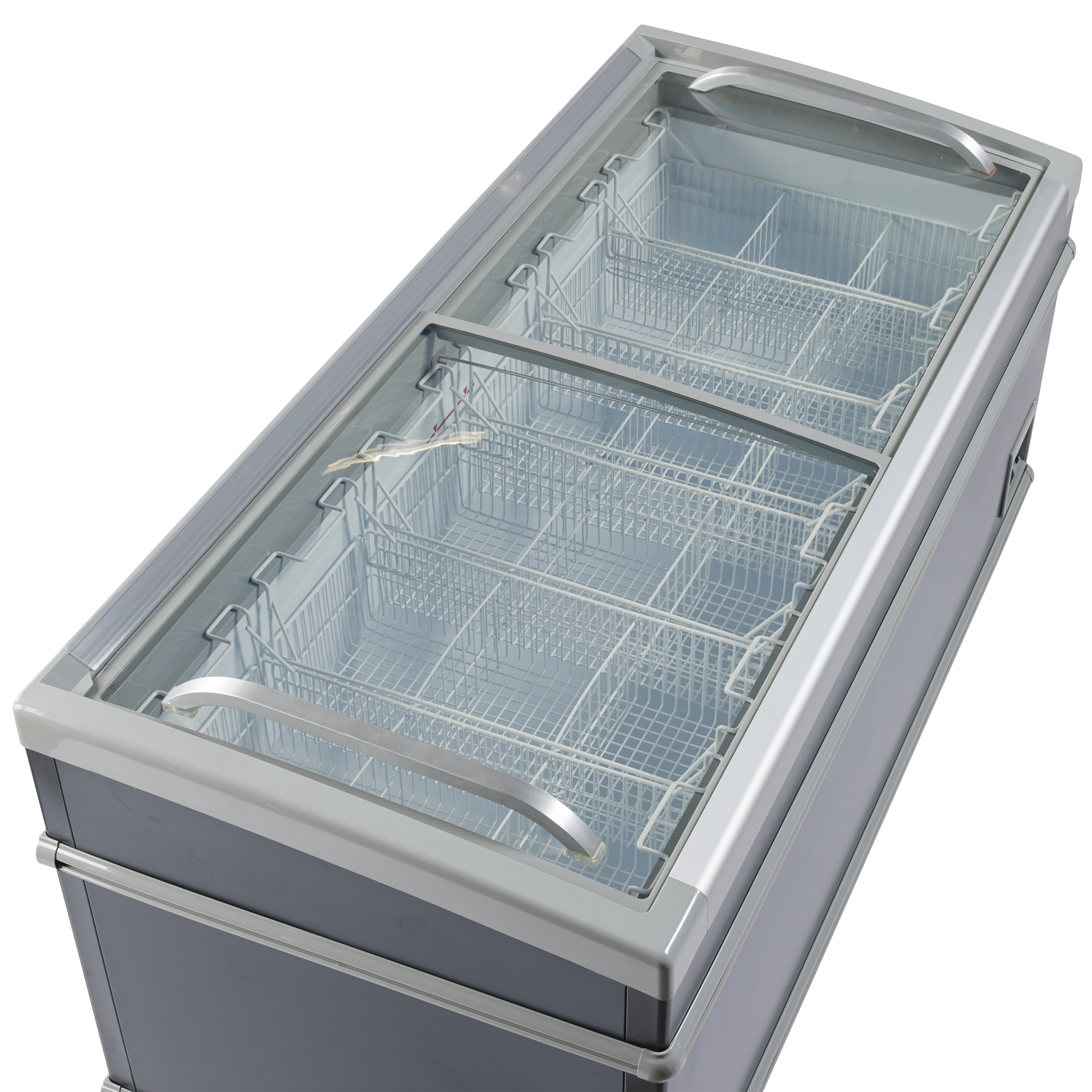 Fryseren leveres med buede transparente skydelåg som holder ekstra på kulden og med stærkt aluminiumshåndtag.