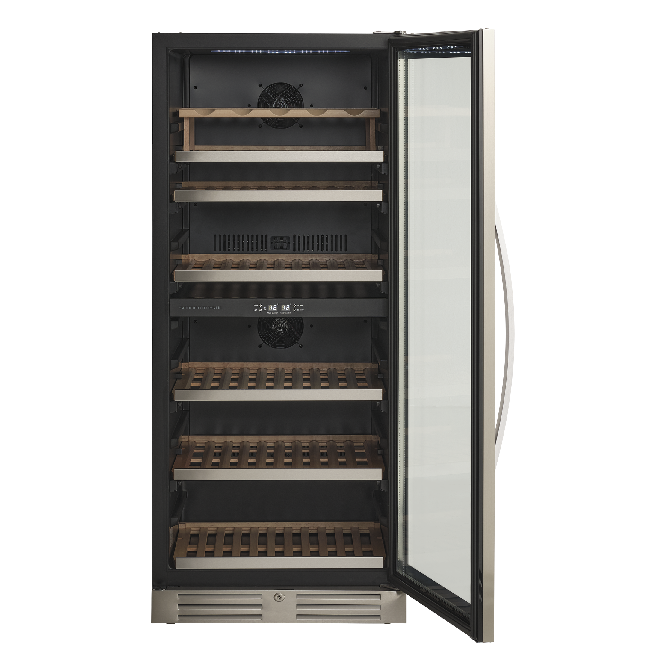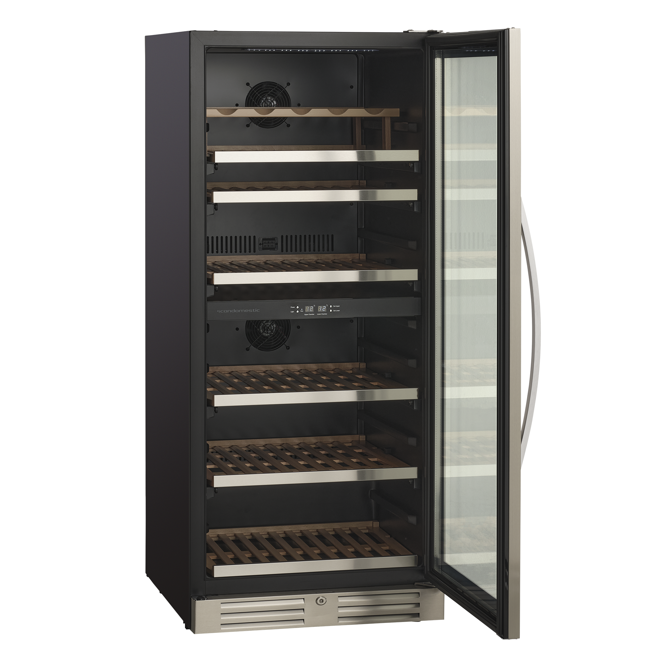 SV 104 X kan bruges til både indbygning og som fritstående vinskab. Skabet har to zoner, kan indstilles mellem 5°C – 18°C uafhængigt af hinanden. Skabet kan rumme 90 flasker fordelt på 6 1/2 hylder i bøgetræ med stålfront, heraf 5 1/2 udtrækshylder og 1 stationær. Et flot skab til opbevaring af dine flasker.