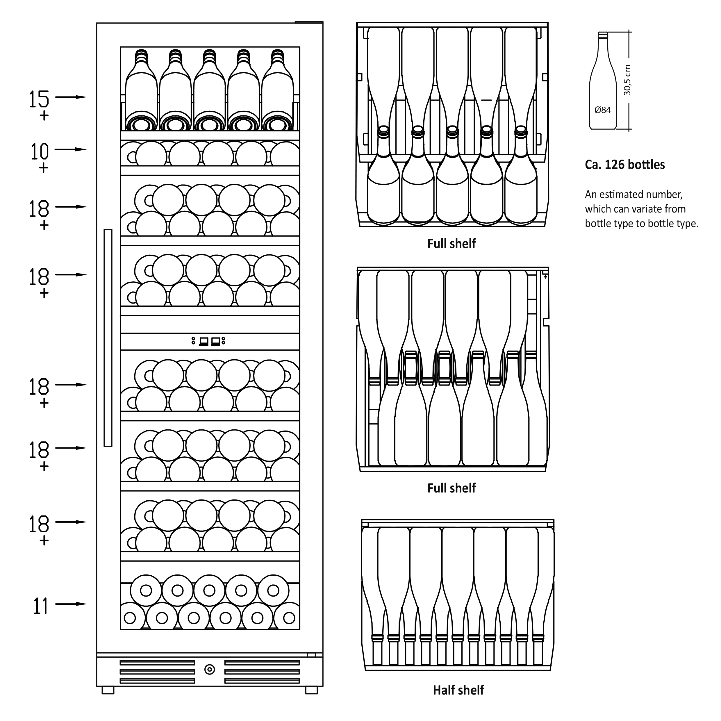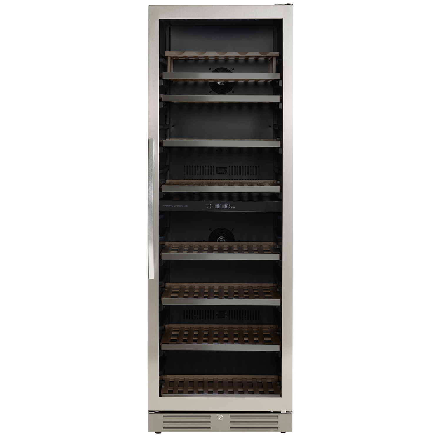 SV 124 X kan bruges til både indbygning og som fritstående vinskab. Skabet har to zoner, kan indstilles mellem 5°C – 18°C uafhængigt af hinanden. Skabet kan rumme 126 flasker fordelt på 7 1/2 hylder i bøgetræ med stålfront, heraf 6 udtrækshylder og 1 1/2 stationær. Et flot skab til opbevaring af dine flasker.
