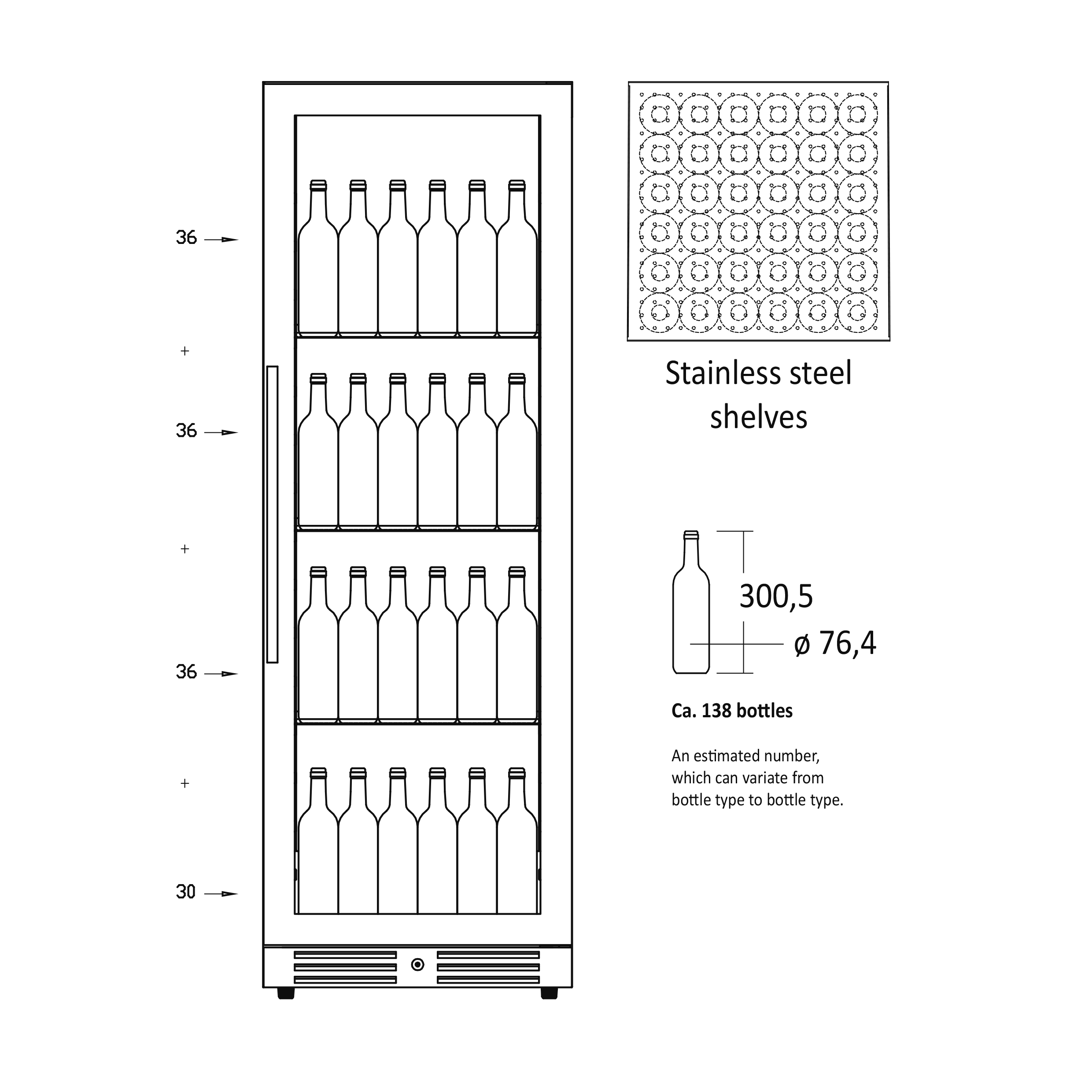 SV 138 B kan bruges til både indbygning og som fritstående serveringsskab. Skabet har én zone, kan indstilles mellem 5°C – 18°C og kan rumme 138 stående flasker fordelt på 3 stålhylder. Et flot skab til at vise dine flasker frem.