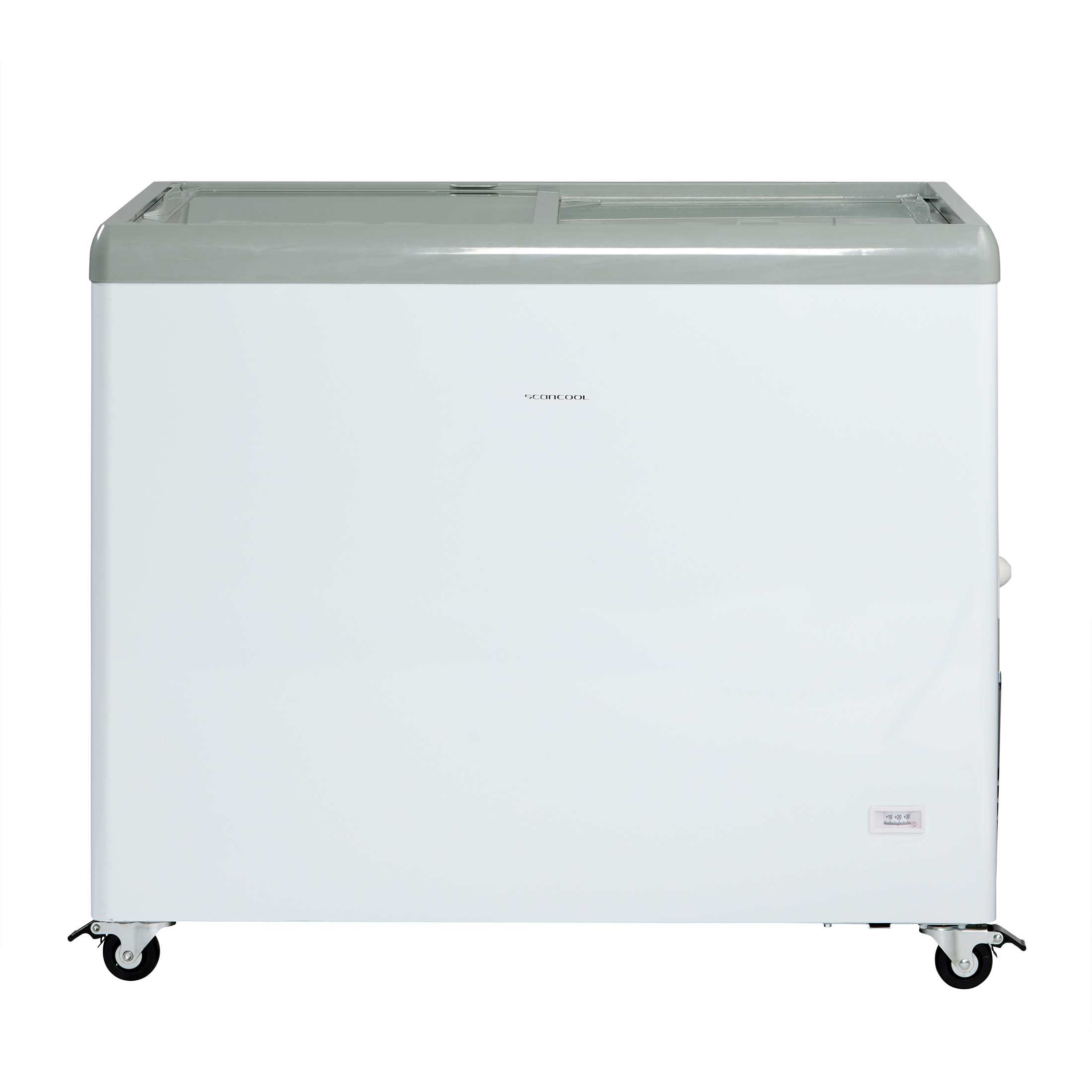 Glassfrysen levereras med platta transparenta skjutlock med integrerade handtag som håller extra kalla förhållanden.