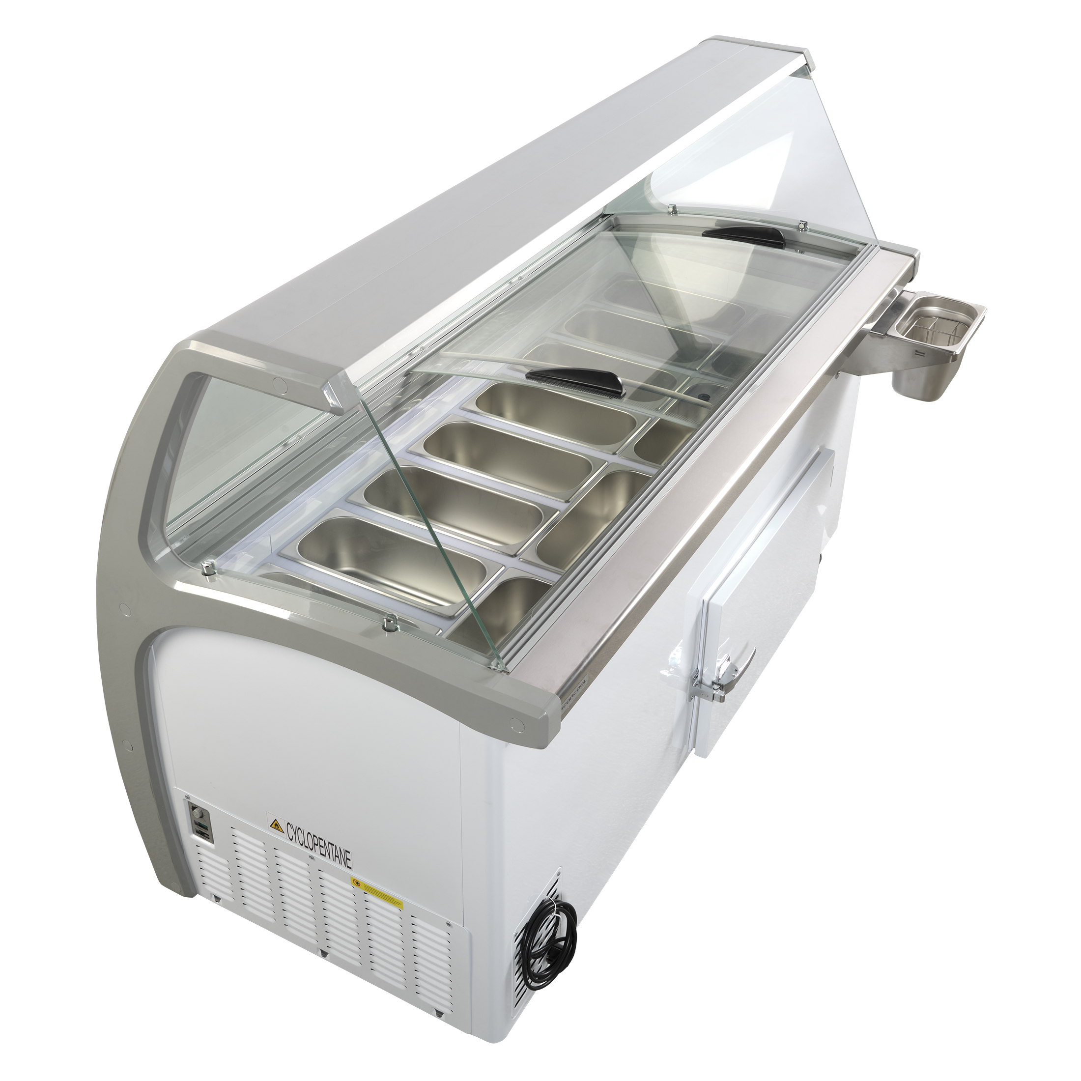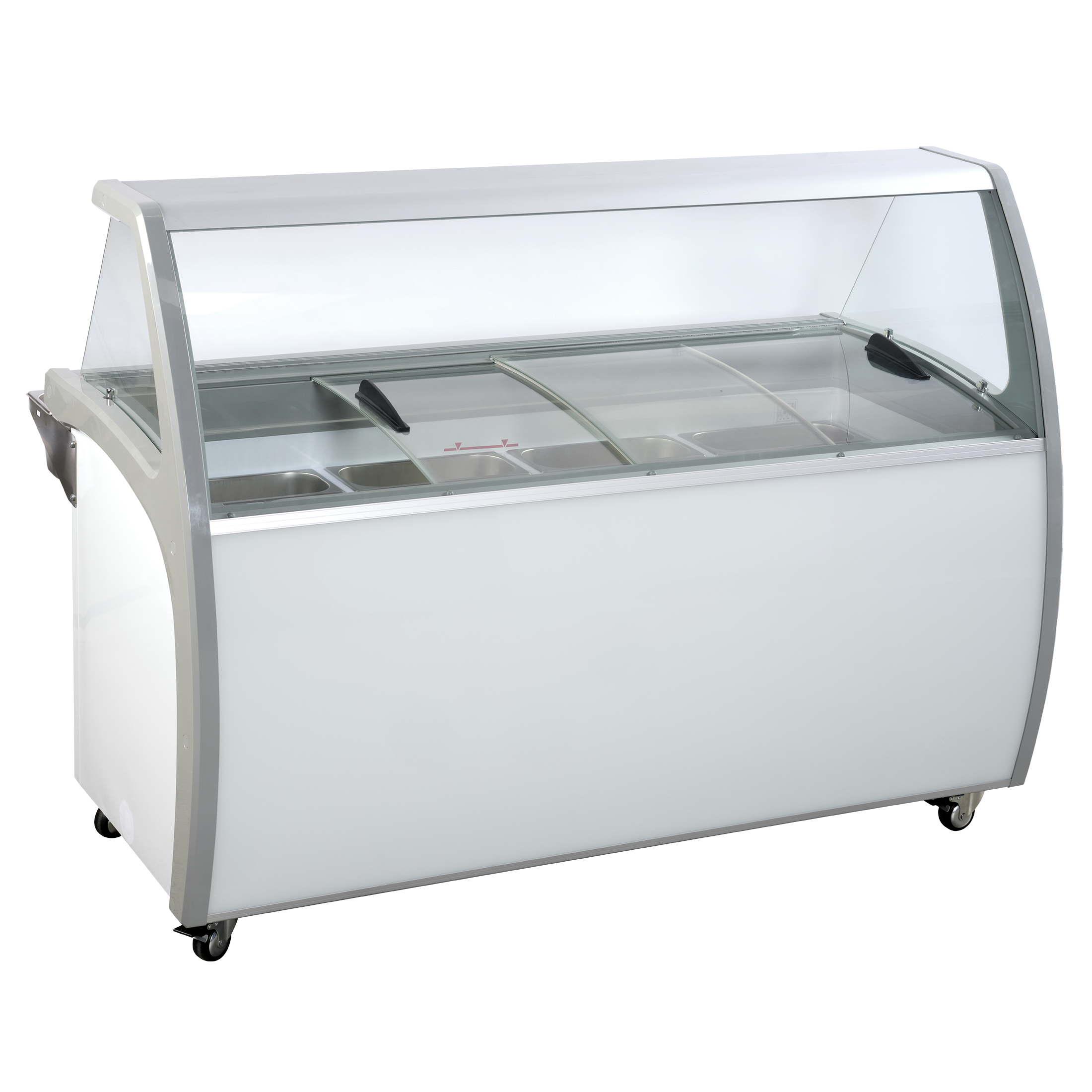 Frysen levereras med böjt frontglas för hygien och snygg presentation. Frontglas och transparenta skjutlock som håller extra kallt ger också en fin och inbjudande presentation av glassen, som lyfts fram på ett elegant sätt och ökar kundernas köplust.
