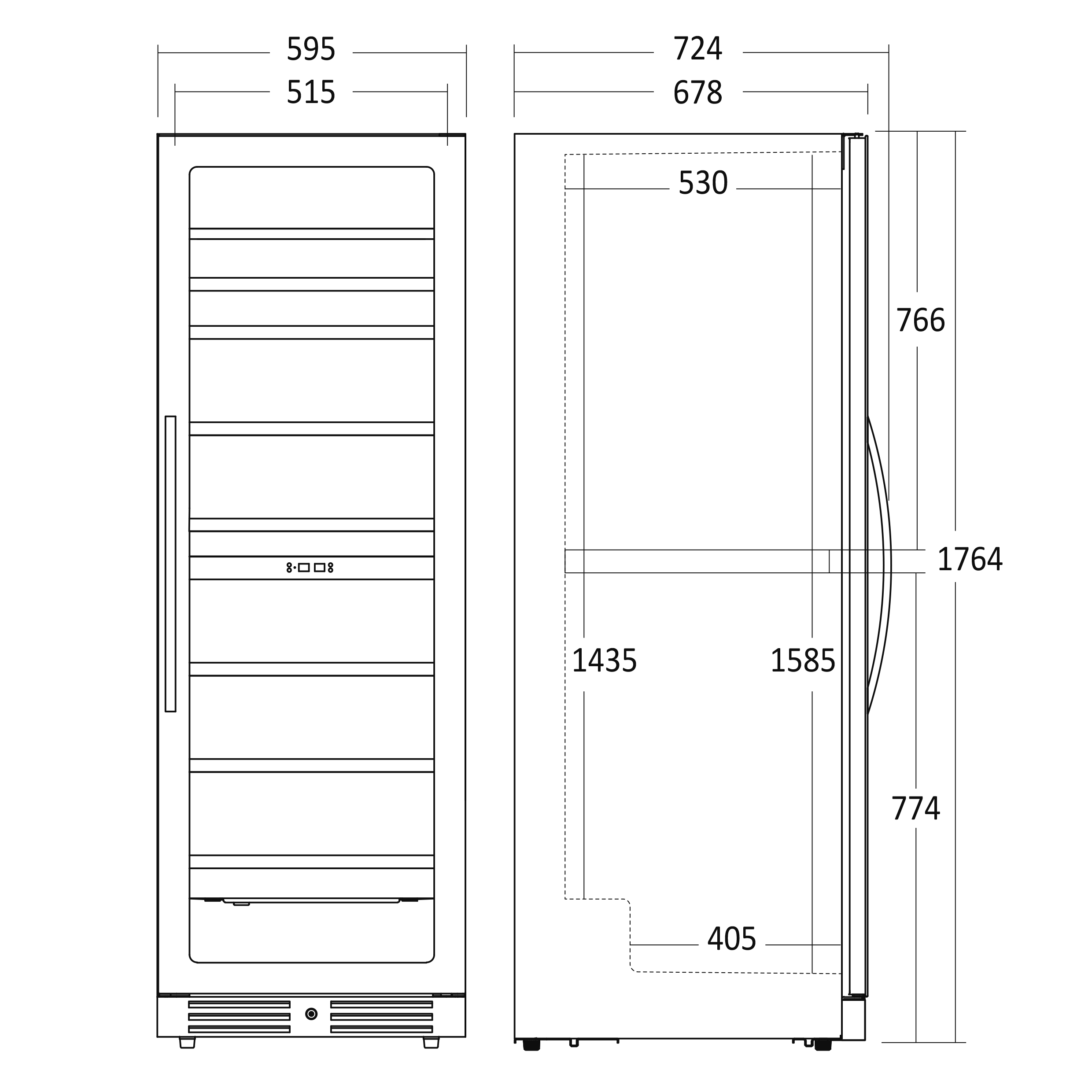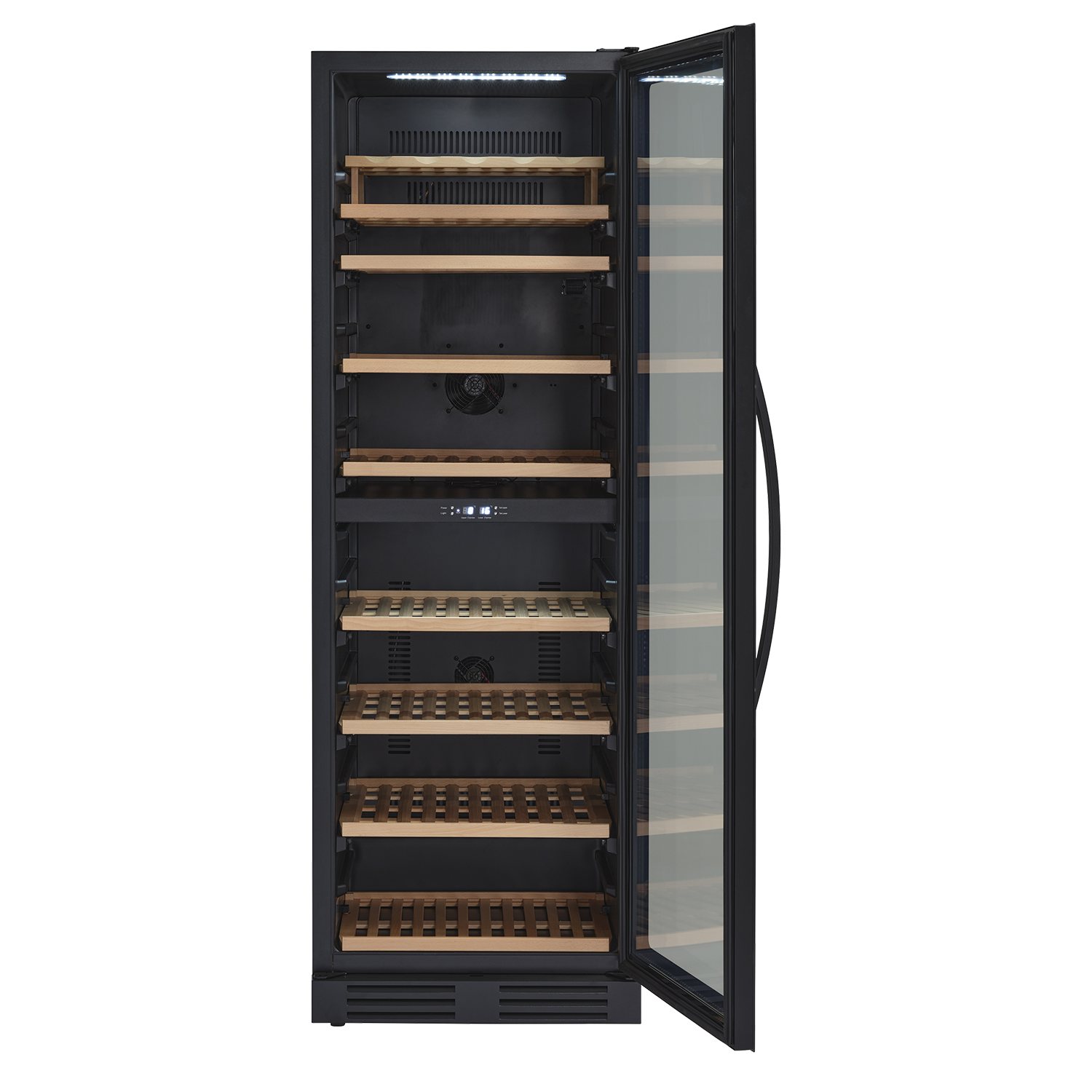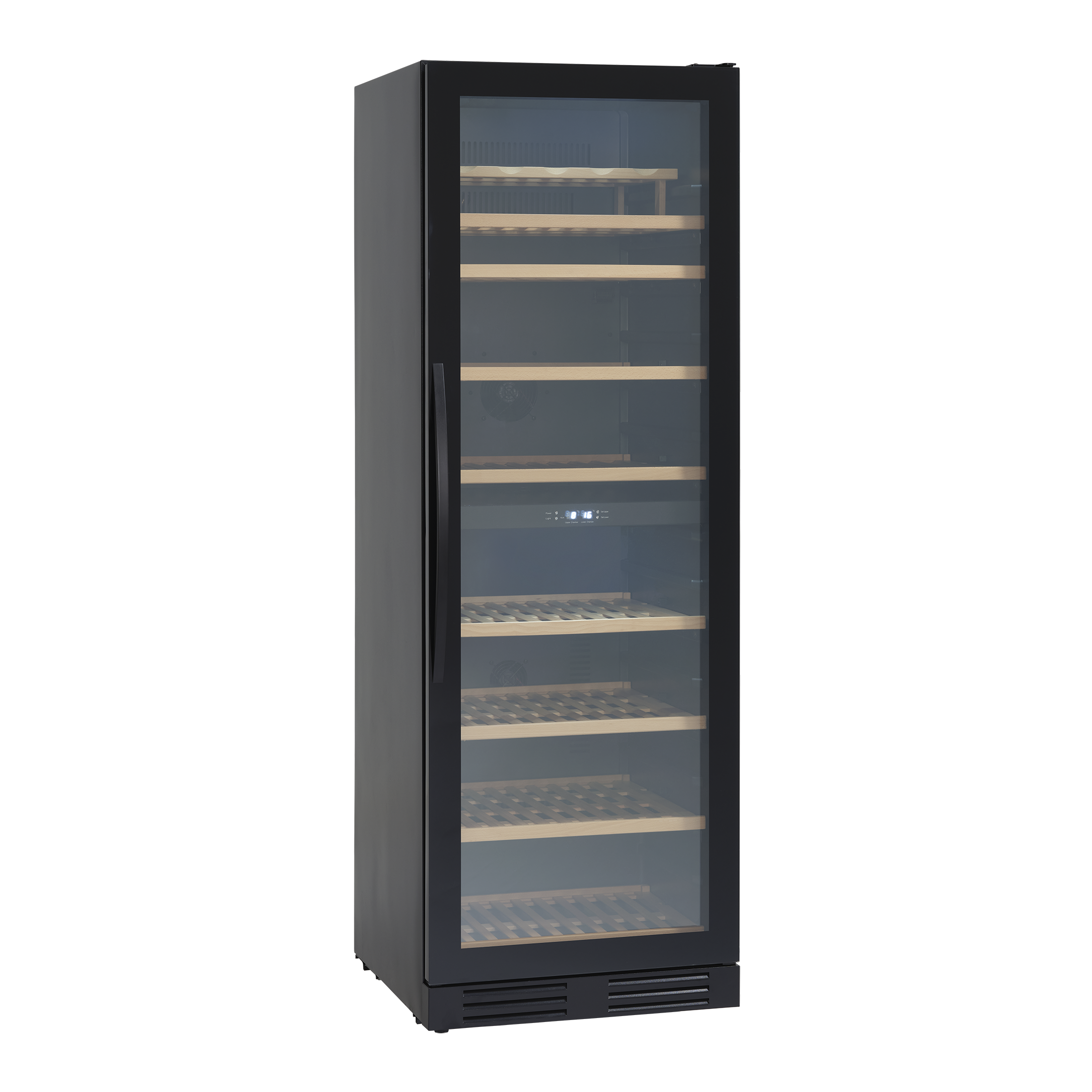 Skåpet har en tidlös design, där den svarta ramlösa glasdörren och innerbelysningen ger skåpet ett exklusivt utseende. Högerhängd dörr med möjlighet till dörrvändning, så det är alltid flexibelt att placera vinskåpet i rummet.